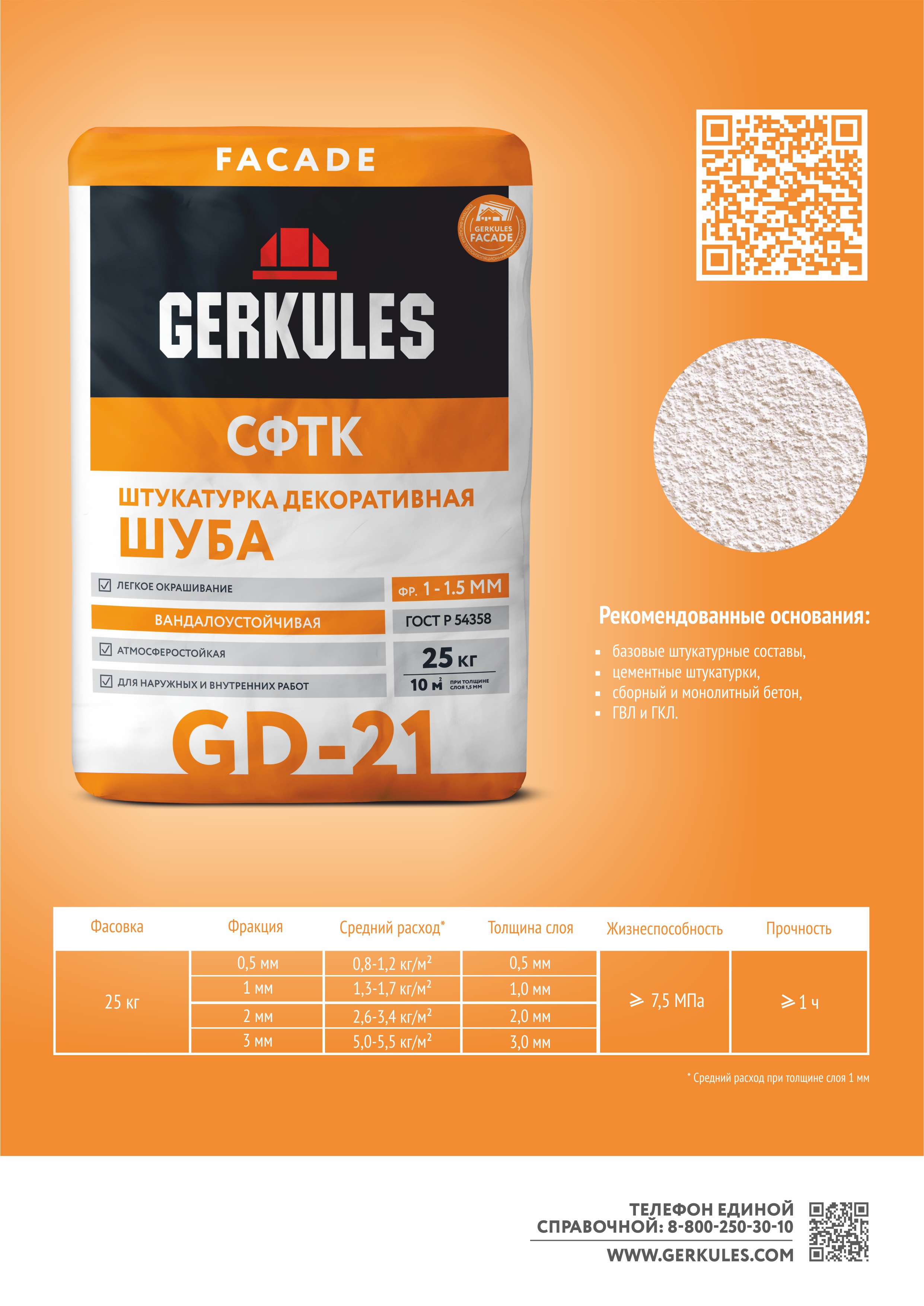 Штукатурка декоративная на цементной основе предназначена для создания защитного слоя с зернистой фактурой «Шуба». Применяется для наружных и внутренних работ в помещениях всех типов под дальнейшее окрашивание. Позволяет получить прочную вандалоустойчивую поверхность, обладающую высоким сцеплением с основанием. Обладает водоотталкивающими свойствами. Обеспечивает класс устойчивости к климатическим воздействиям КВ 1 (ГОСТ Р 55943) в СФТК GERKULES FACADE.